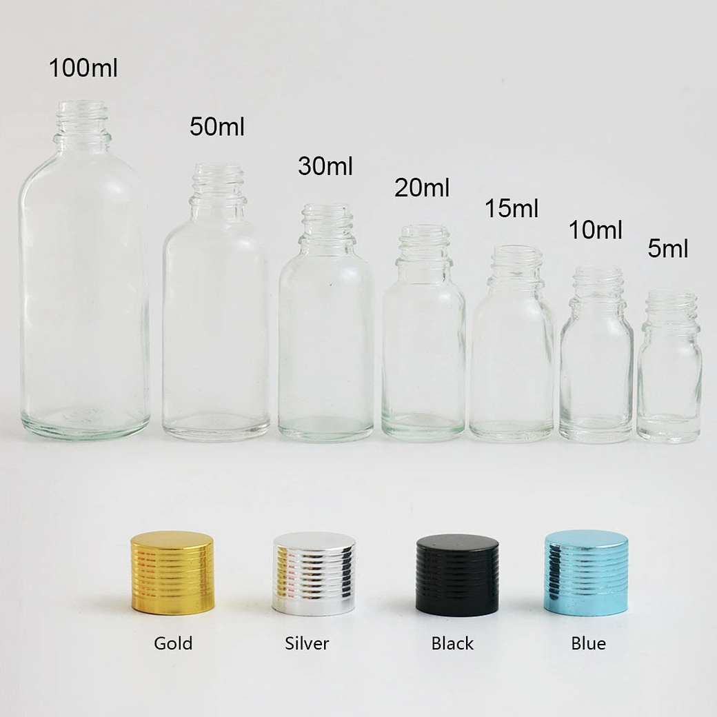 100ml 50ml 30ml 20ml 15ml 10ml 5ml 1Clear Glass Essential Oil Bottles Containers Packaging With Reducer Aluminum Lids