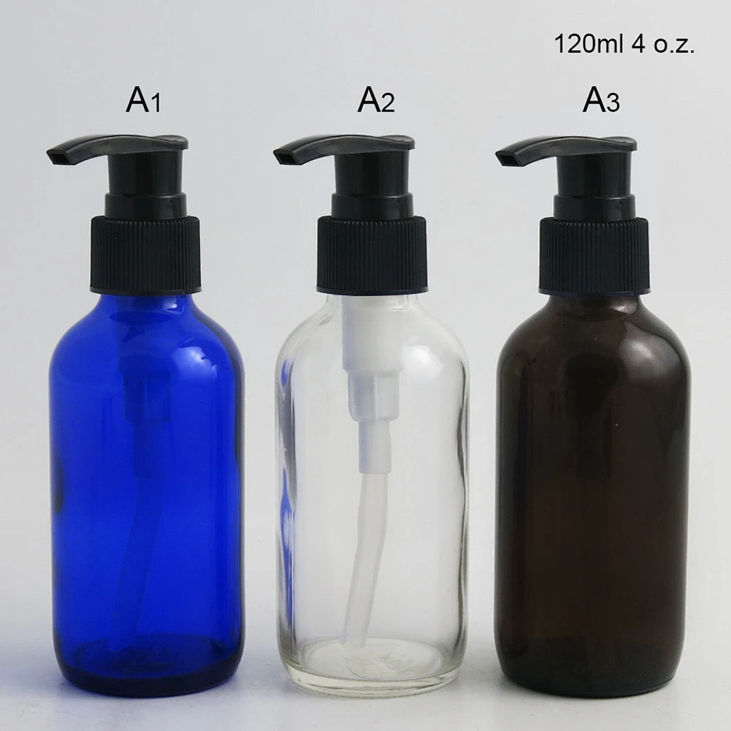 120ml Large Empty Refillable Amber Blue Clear Boston Round Glass Bottle With Black White Lotion Pump 120ml Liquid Container