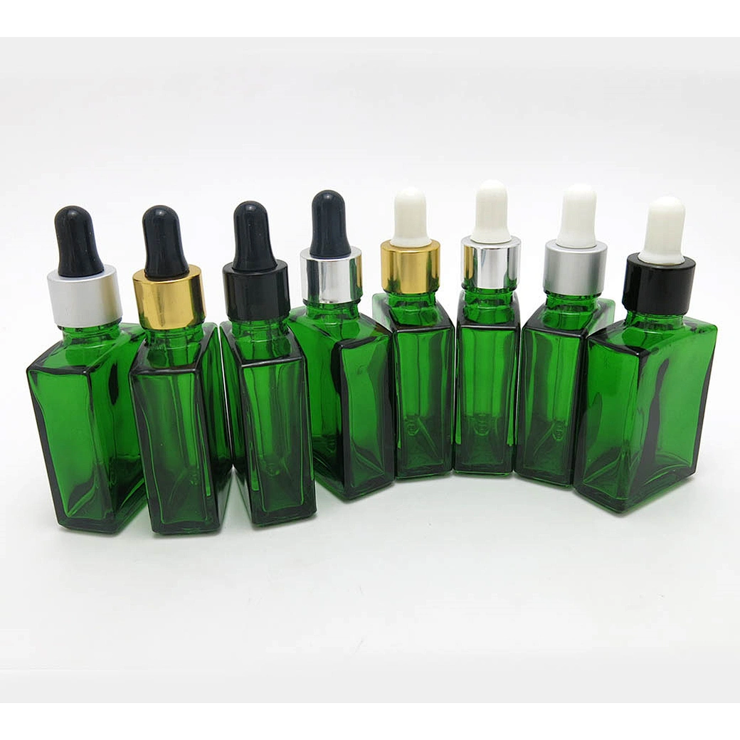 30ml green flat square glass bottle with aluminum dropper 1oz Empty glass dropper container with various kinds of dropper