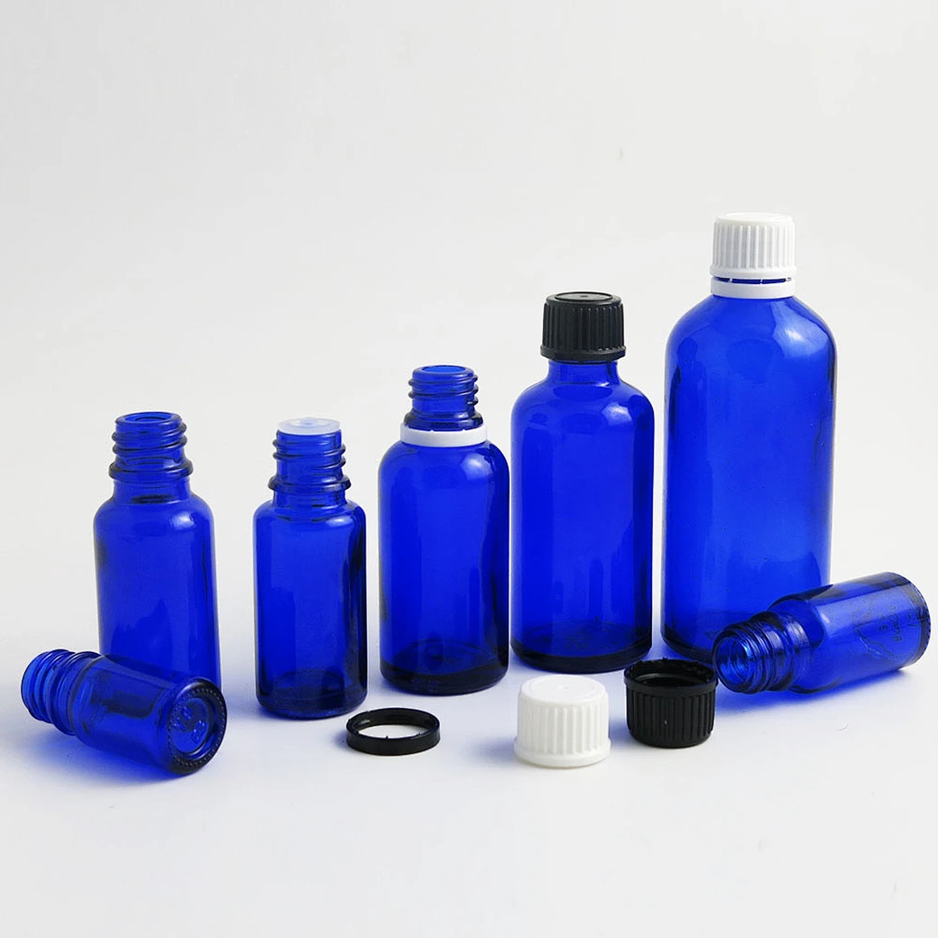 5ml 10ml 15ml 20ml 30ml 50ml 100ml amber blue essential oil bottles with orifice reducers and black white tamper evident caps
