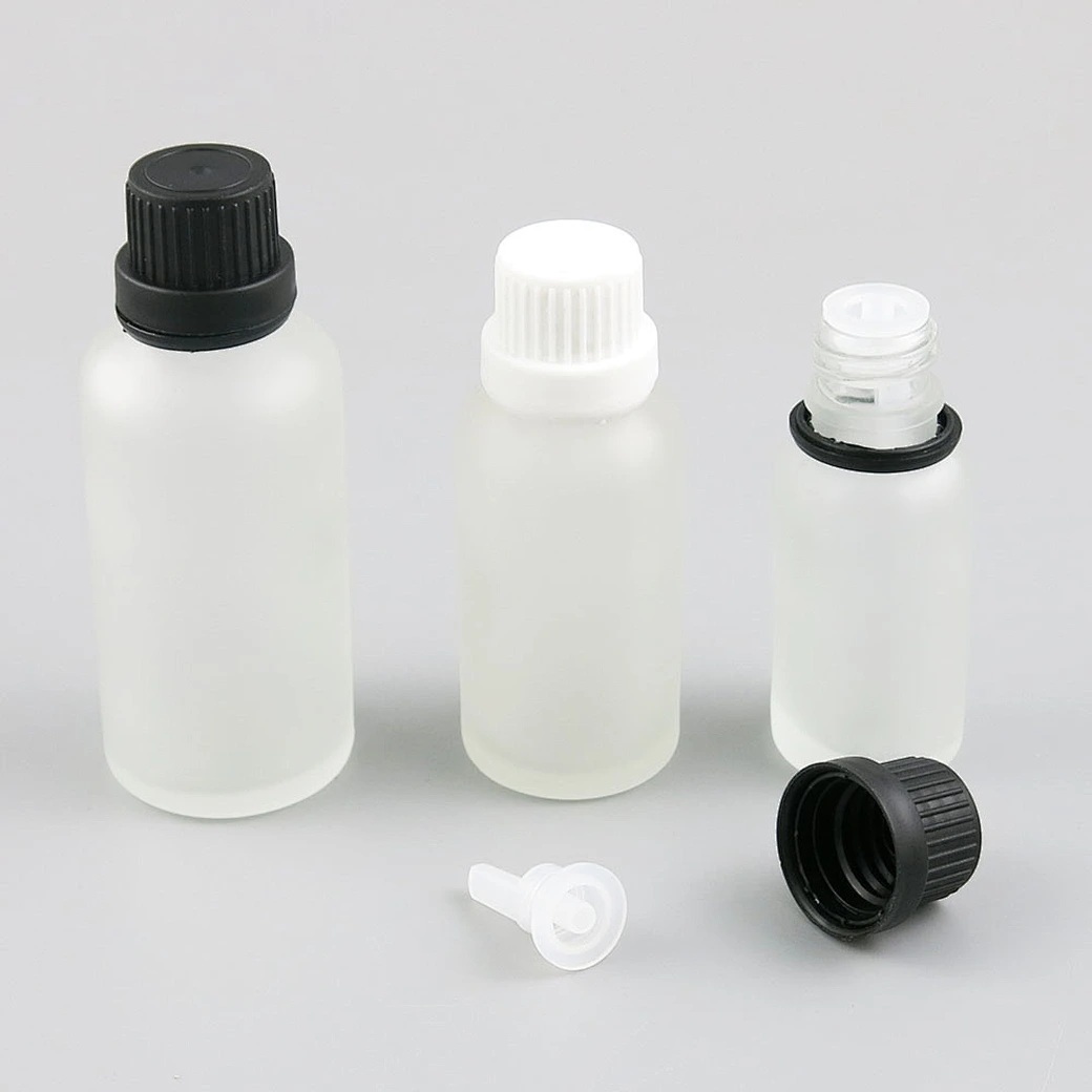 5ml 10ml 15ml 20ml 30ml 50ml 100ml Frosted glass essential oil bottles vial container with orifice reducers black white tamper evident caps