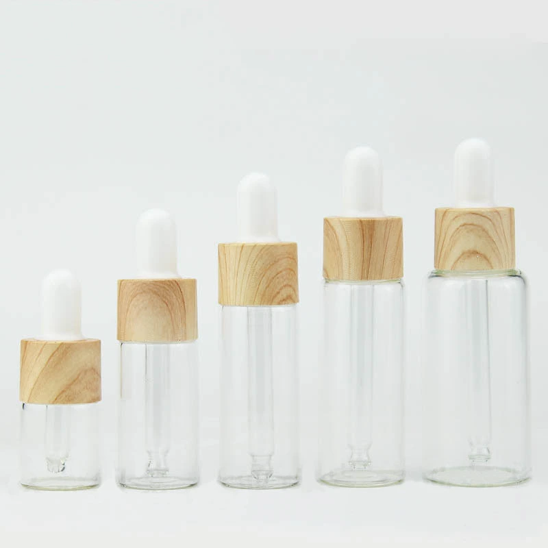5mL 10mL 15mL 20mL 30mL high end clear dropper cylinder glass essential oil bottles with wooden grain lid