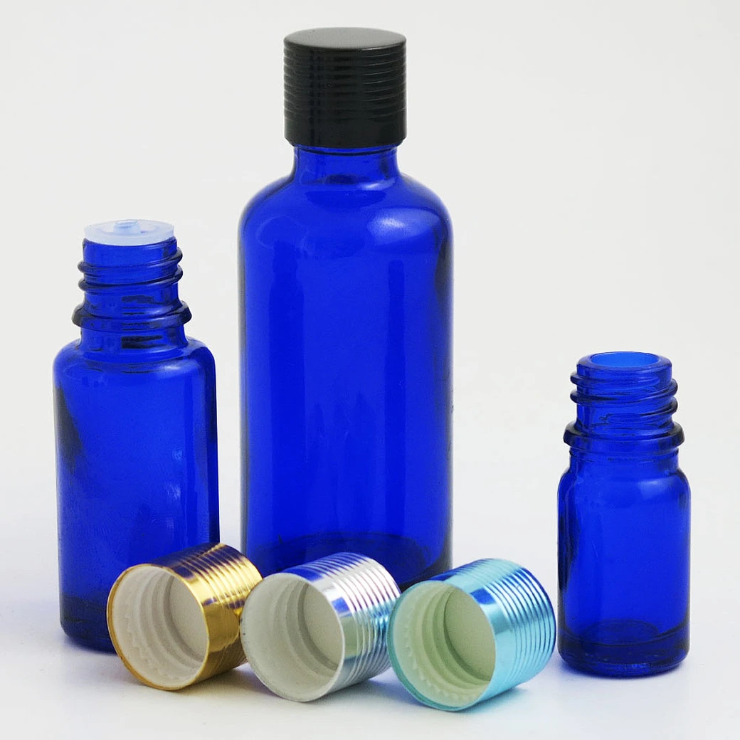 blue glass essential oil bottles containers packaging with reducer aluminum lids 100ml 50ml 30ml 20ml 15ml 10ml 5ml