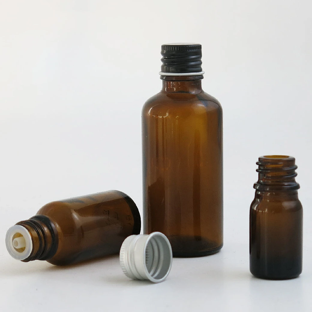 Empty amber glass essential oil bottle containers with aluminum cap with insert 5ml 10ml 15ml 20ml 30ml 50ml 100ml 12pcs