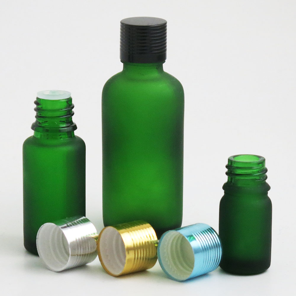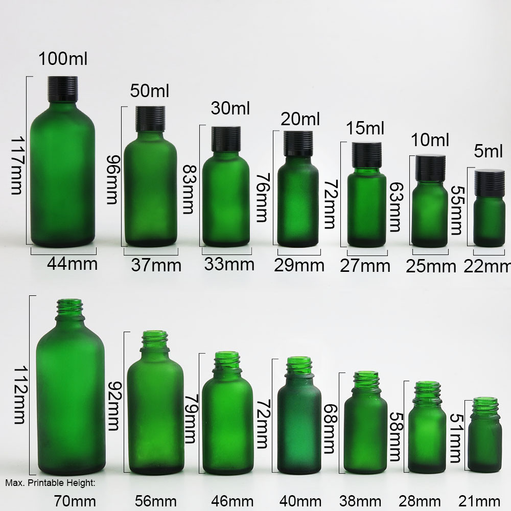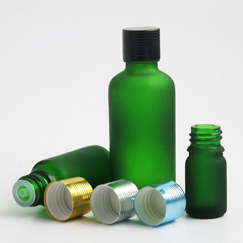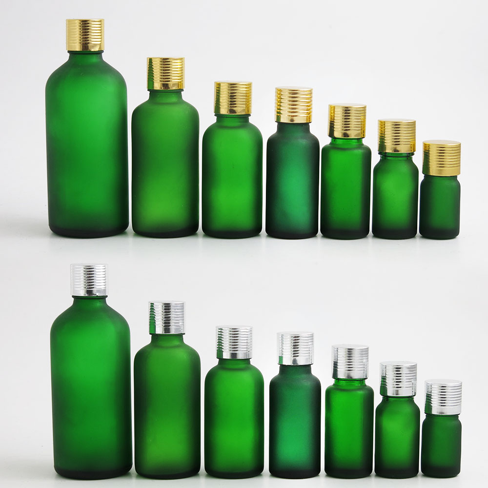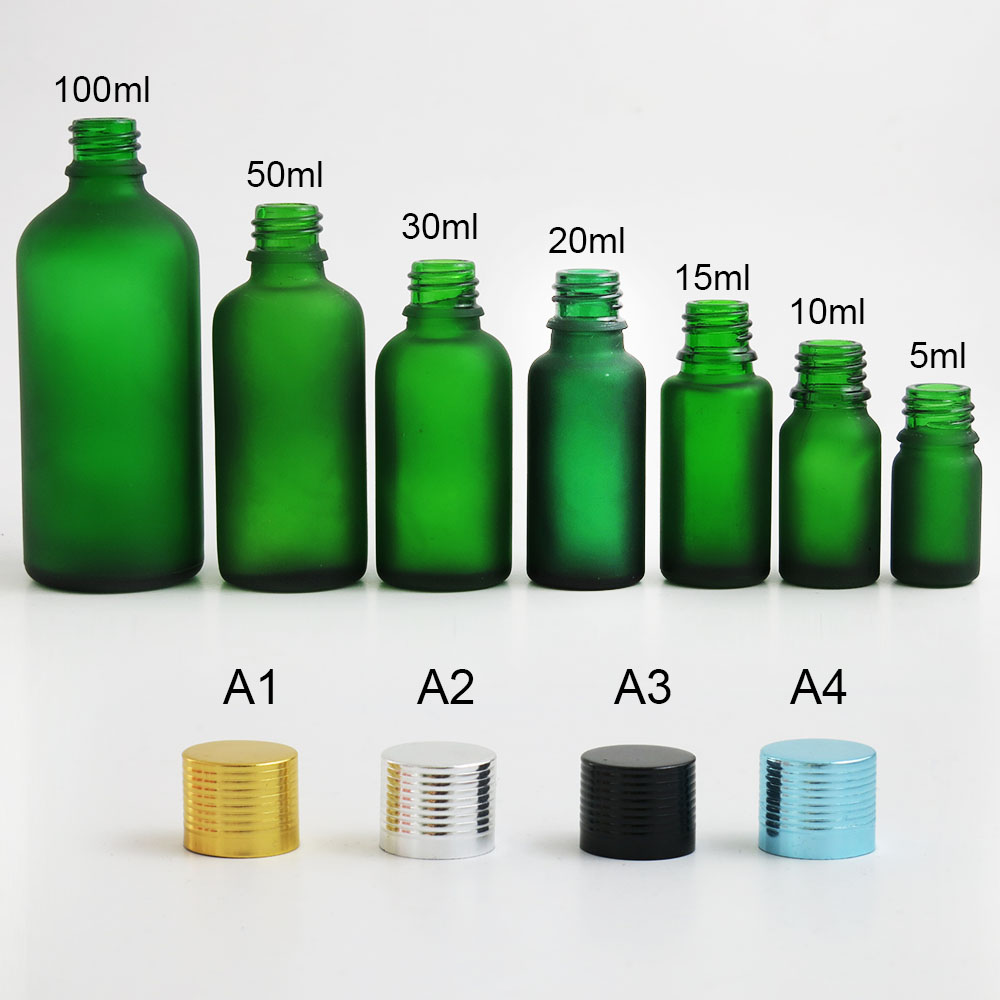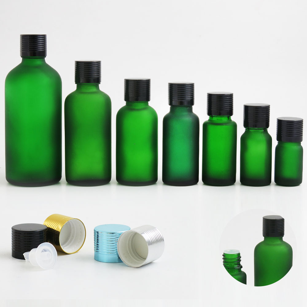 frost green glass essential oil bottles containers packaging with reducer aluminum lids 100ml 50ml 30ml 20ml 15ml 10ml 5ml