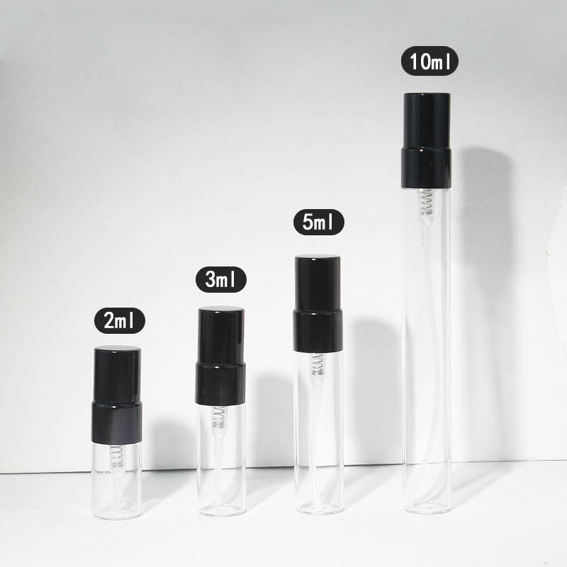 In Stock for Wholesale: Transparent & Black Screw-Top Perfume Spray Bottles – 2ml 3ml 5ml 10ml Refillable Glass Sample Perfume Bottles.