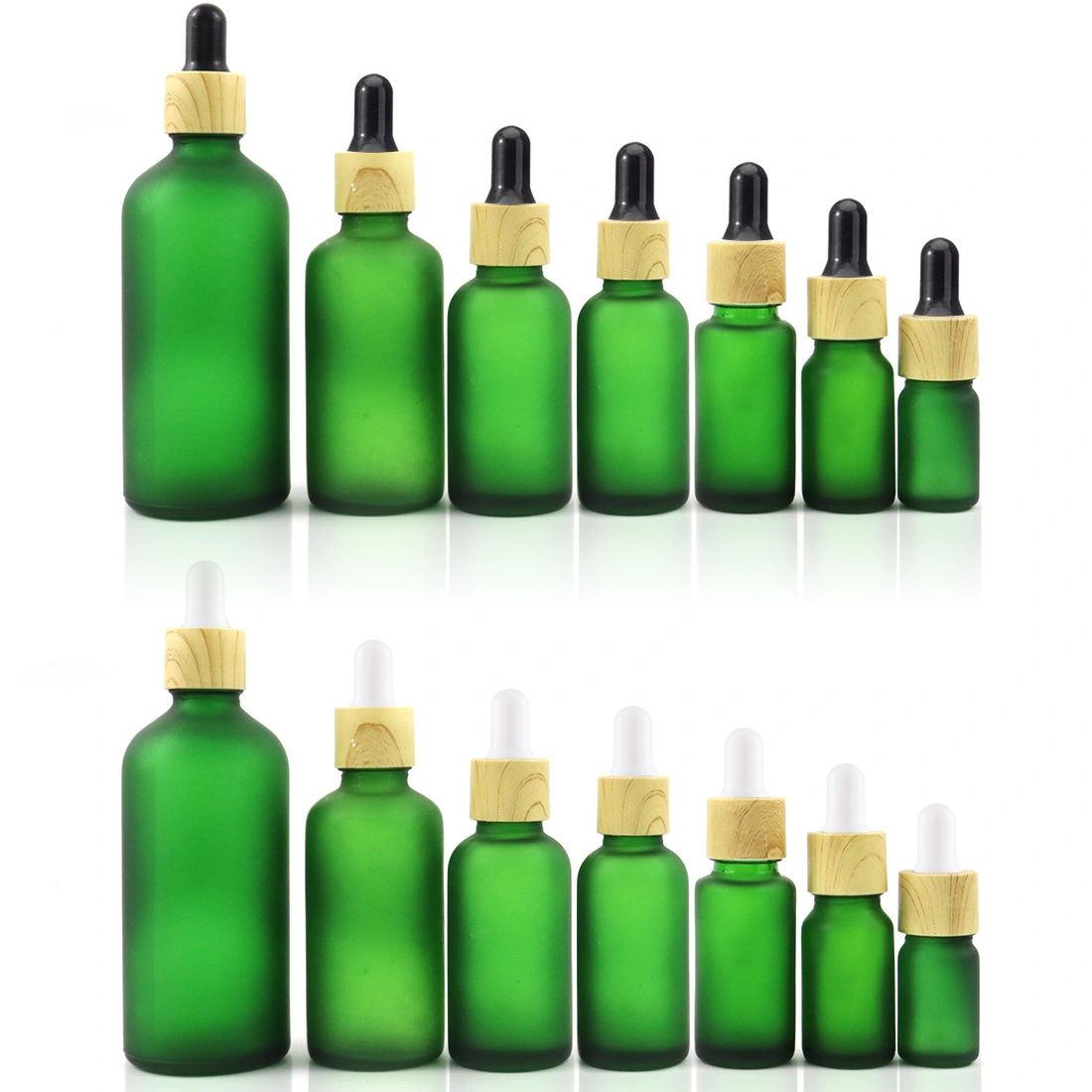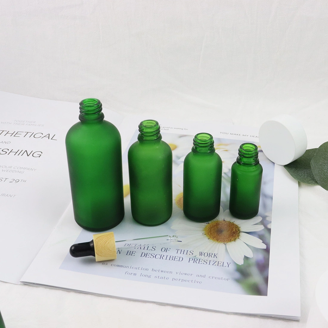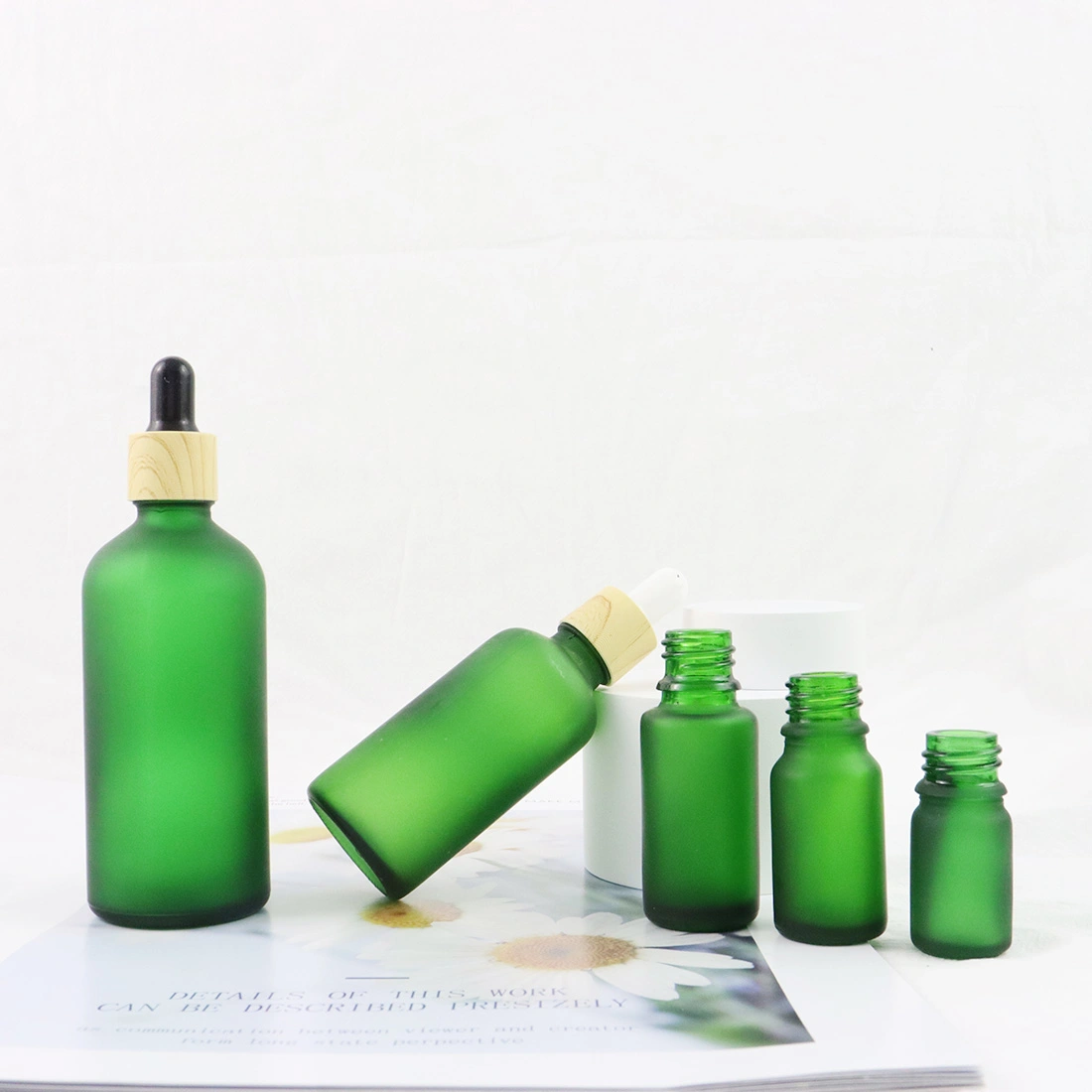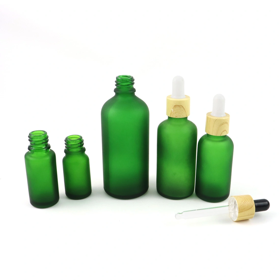 Luxury Boston Round Glass Essential Oil Dropper Bottle Green Frosted Glass Dropper Bottle With Bamboo Cap