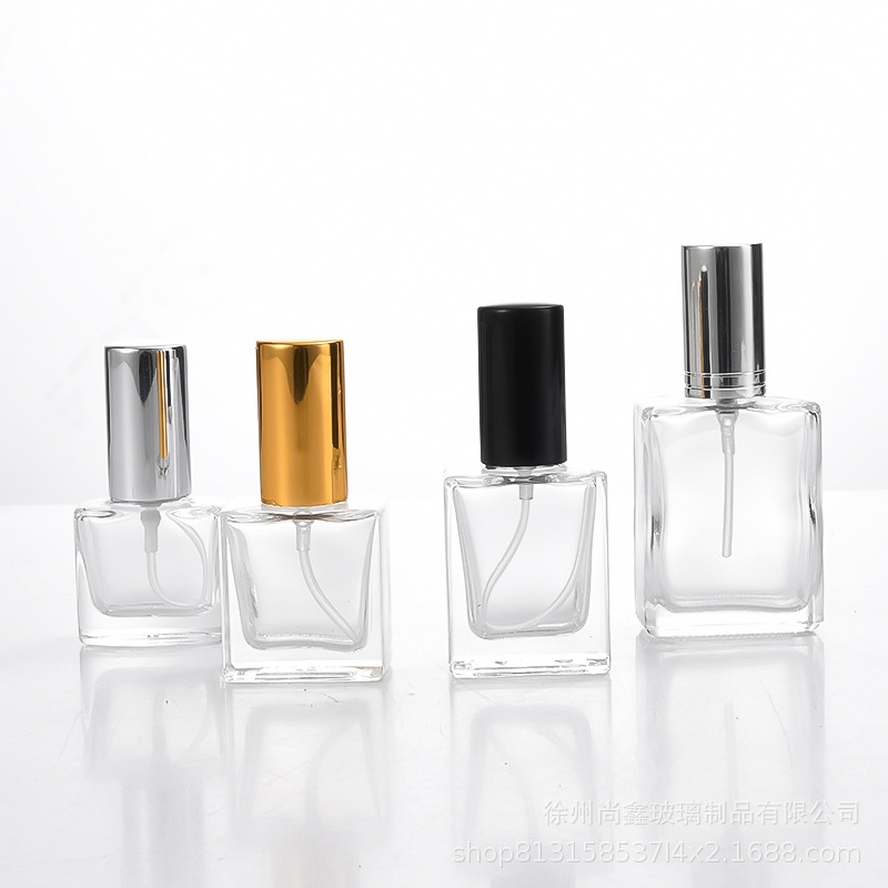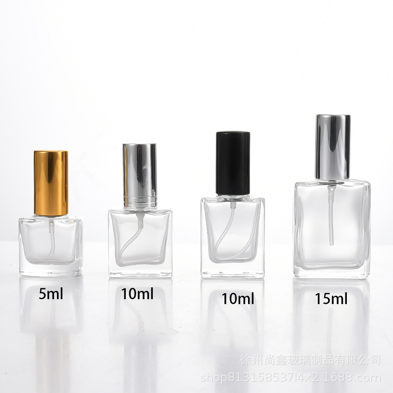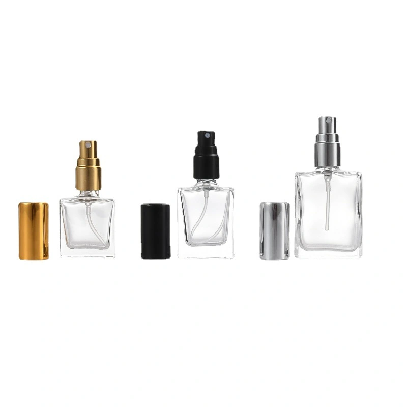 New Design Clear Thick Wall Square Gold Aluminum Caps Spray Glass Cosmetic Container Packaging Glass Bottle