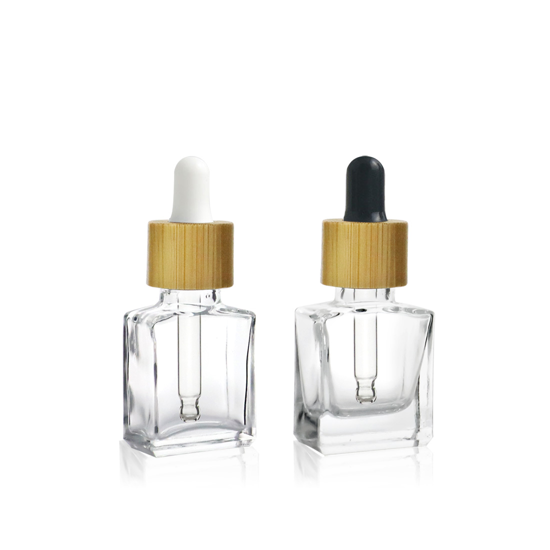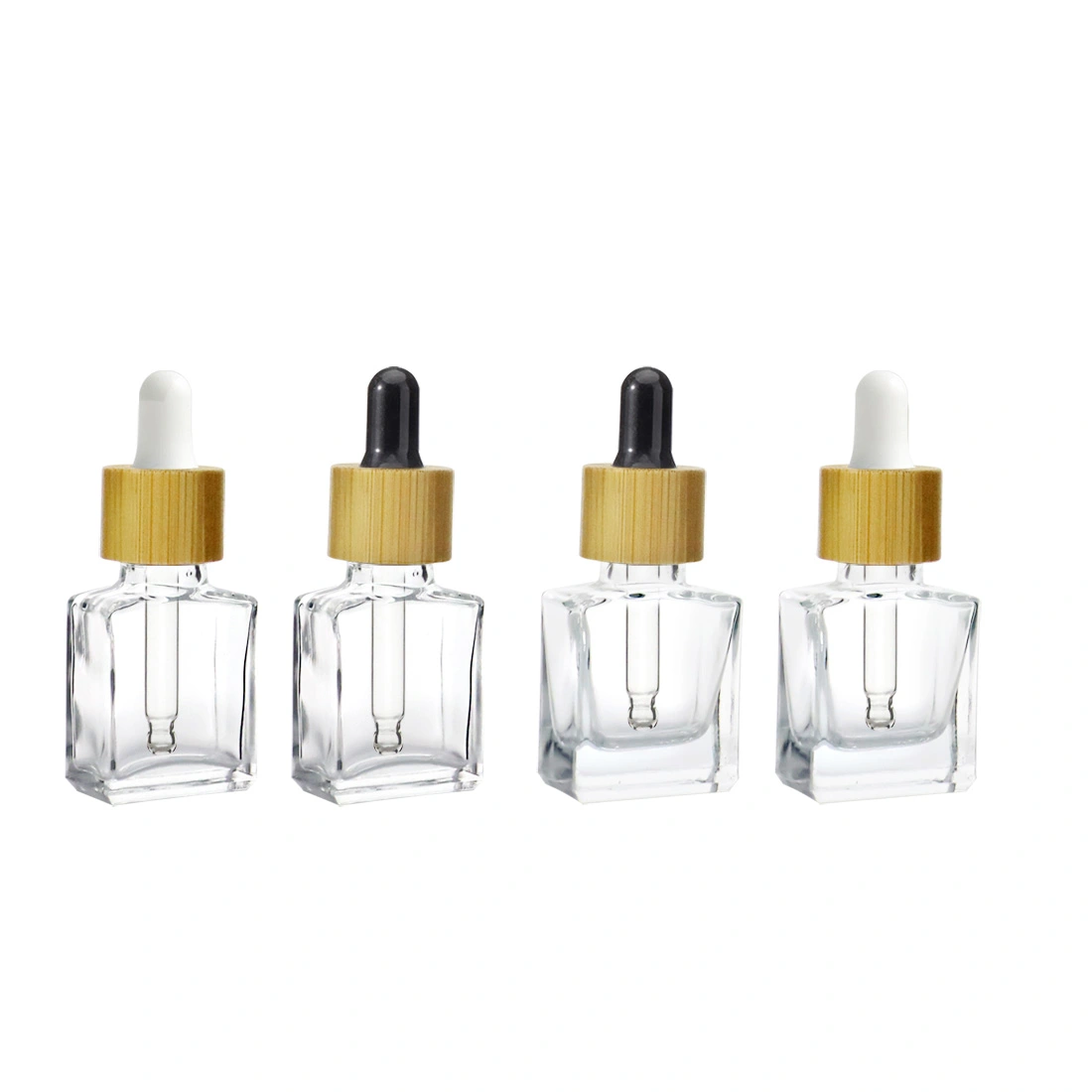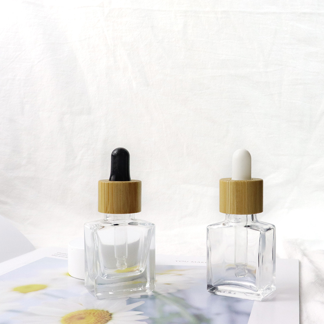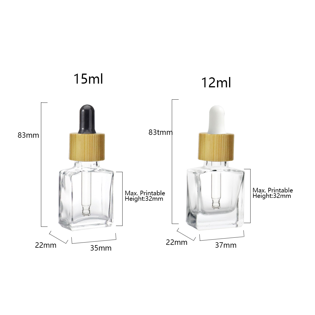 Popular Empty Clear Flat Square Rectangle 12mL Cosmetic Skincare Packaging Glass Dropper Oil Serum Bottle With Bamboo Cap