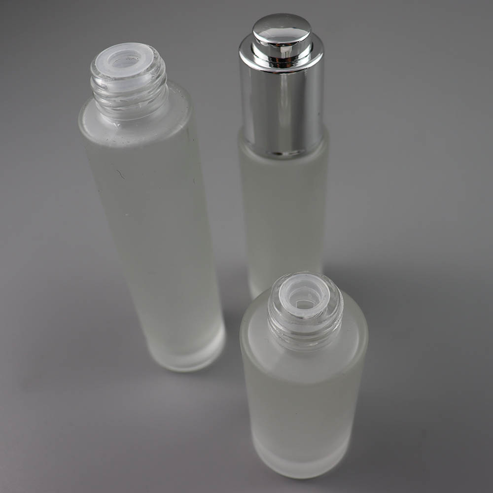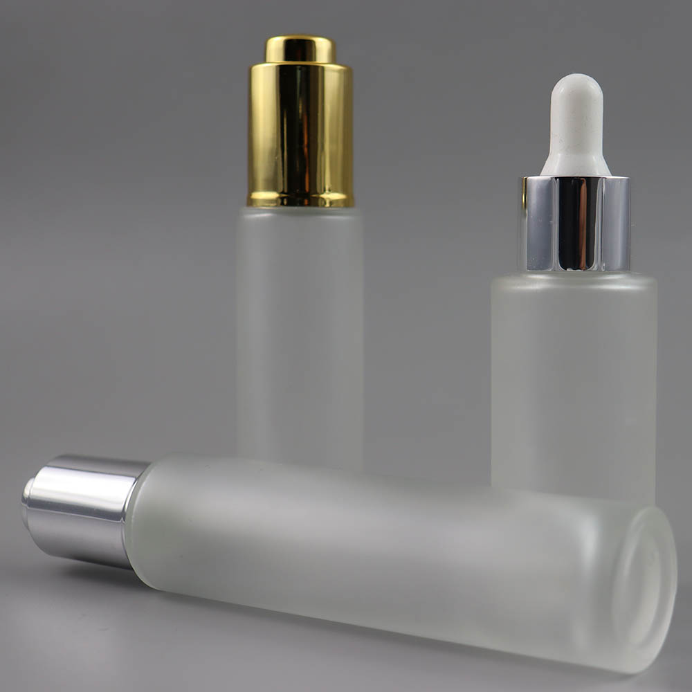 Wholesale Push Button Flat Shoulder Essential Oil Bottle Customize Frosted Cosmetic Glass Dropper Bottle