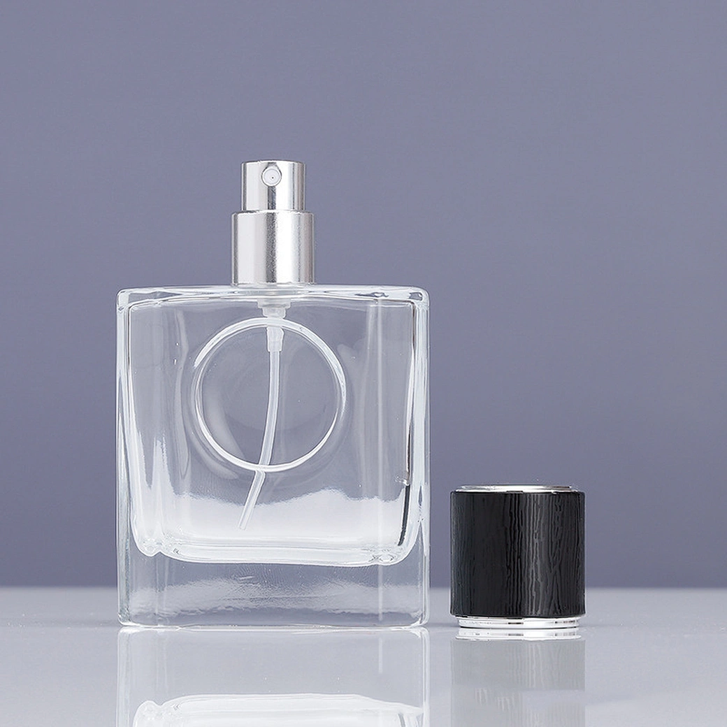| product name | Wholesale transparent 15 bayonet flat square 50ml perfume bottle with black and silver cap fine spray cosmetic dispensing glass bottle |