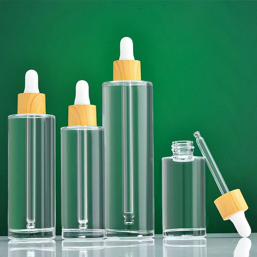 Wholesale wood grain cap lotion bottle cosmetic dispenser bottle transparent essence glass bottle rubber tip dropper essential oil bottle